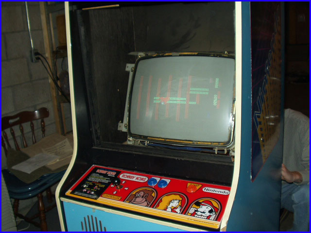 The game booted up for the first time. The monitor is "squeezed" and, obviously, needs rotated (which we'll do once we get some brackets and brace). However, the fact that the game booted is a GOOD thing!! <<- Back