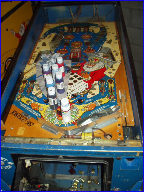 Before waxing, I used some "acrylic" paints to touchup a couple areas of the playfield including some missing paint in the rear, border around lift-ramp and black outlining various inserts.