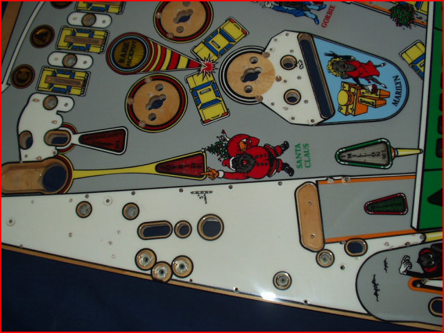 .... ABOVE: There was also wear (along with around Marilyn and Gorbie) around the Santa insert. Ball swirls were also present around the pop bumpers. BELOW: The touchup was perfect. The ball swirs are no more.