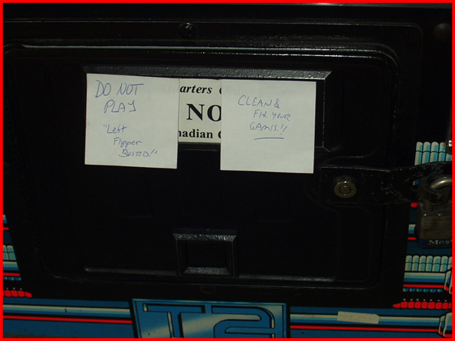 Local laundry mat: A Terminator 2 that was kept-up so poorly it was a disgrace to pinball. I decided to tell this operator what I felt. :) <<- Back