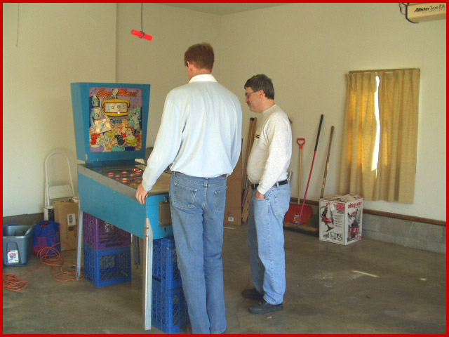 I did some shopping for Mark McIntyre for about a year or so (right). My pin-friend Thomas (left) was selling and Egg Head and set it up in my garage since Mark was coming over. Mark purchased the game and the flipper buttons shocked him pretty good. Wow........fried Mark.