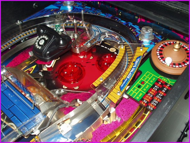 The rear of the playfield. All around, I'd say Who Dunnit? is a beautiful machine! Notice the roulette plastic, telephone (that flashes when lit) and casino bumpers.