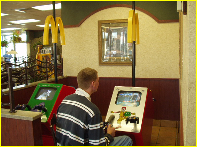 We arrived in Ohio an hour ahead of schedule. So, we stopped at McDonalds to get a bite to eat. Take a look at where Thomas spent his time during breakfast. Playing GameCube. ;) <<- Back