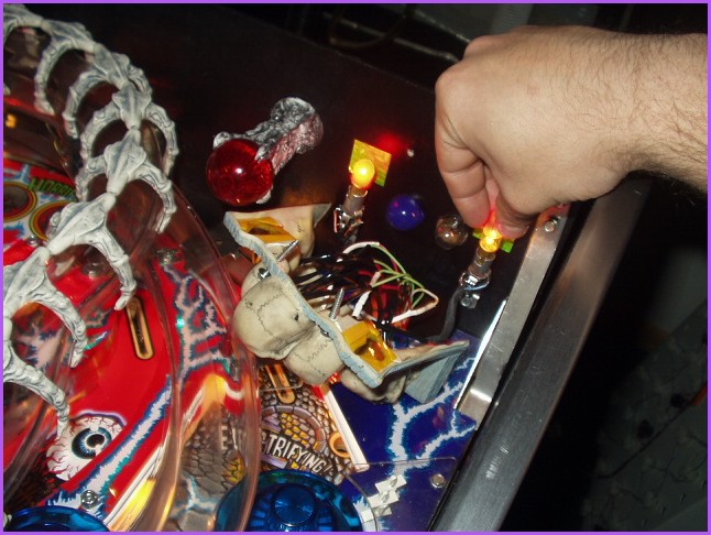 Take the orange bulb covers out and install. If you see an edge of the bulb shining through, gently push down with your hand and angle the cover. If the light shines though on the back, that is okay since the foil will refract it. <<- Back