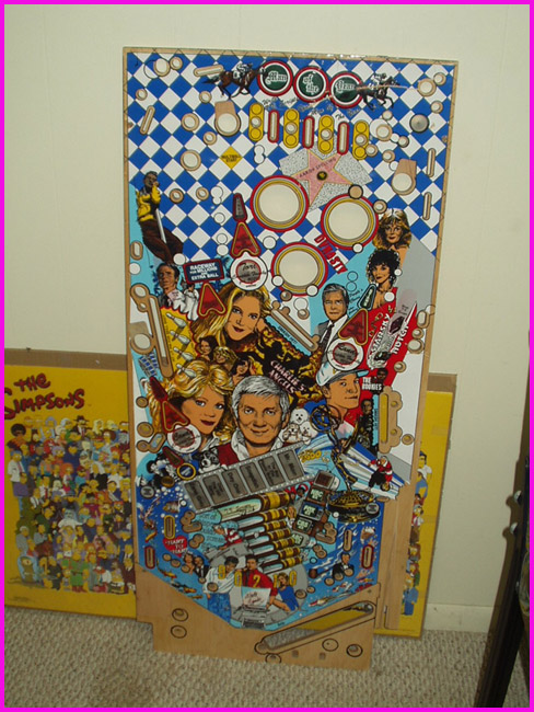 Collector friend Mike C. shows off his "near one-of-a-kind" Aron Spelling playfield (Data East "Lethal Weapon" mod). <<- Back